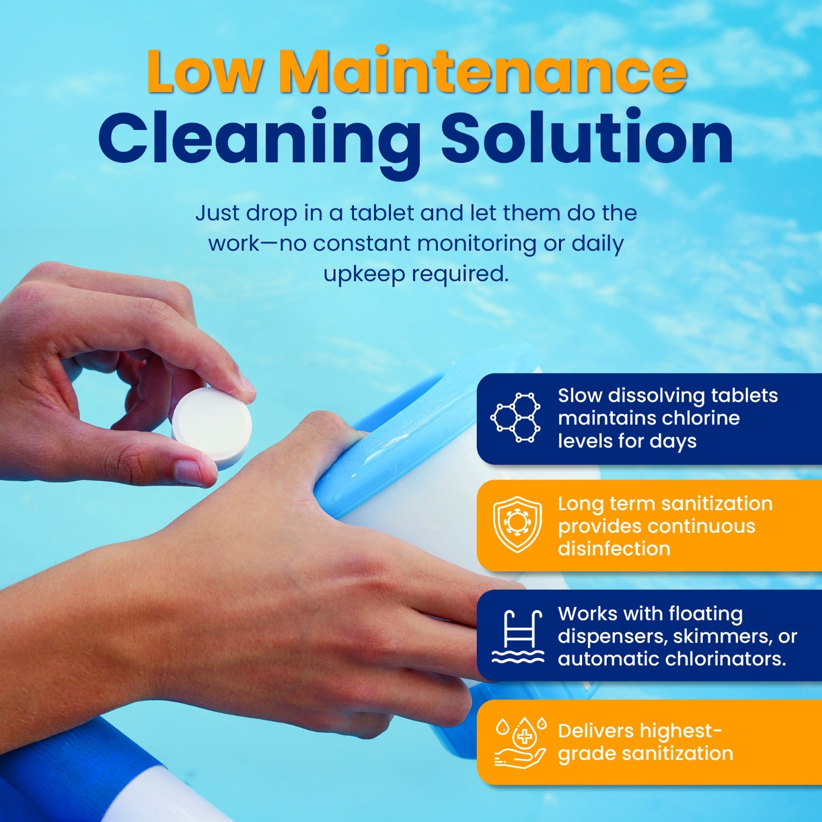 No more guessing how to keep your pool clean. Pool Sharkâ s slow-dissolving tablets consistent chlorine levels so your pool stays swim-ready with next to no effort. Effective for small backyard pools as well as large community pools.